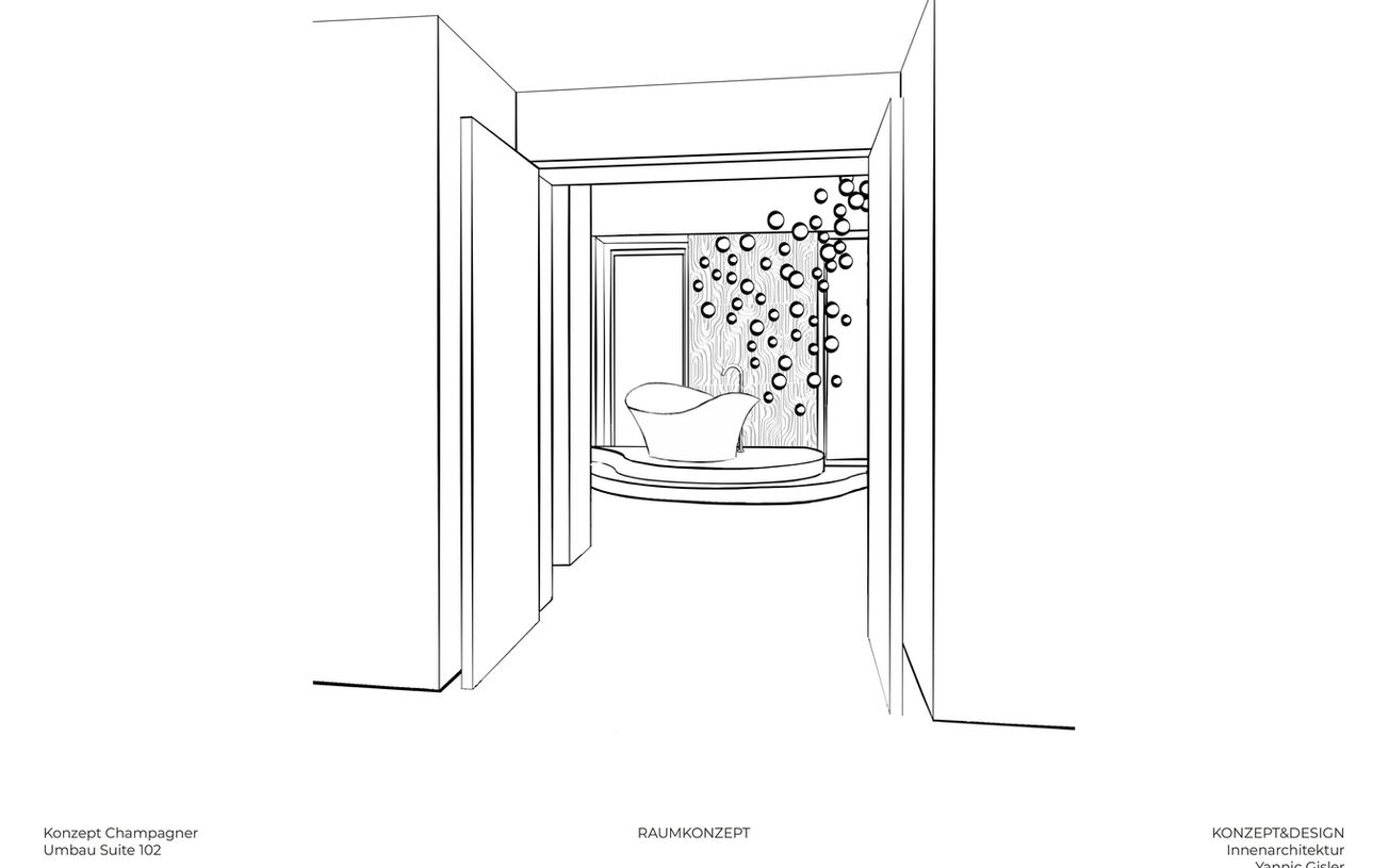 Inspiriert von der Farbwelt, der feinen Perlage und der festlichen Stimmung des Champagners verbinden sich sanfte, schimmernde Töne mit edlen Materialien, feinen Texturen und sorgfältig gesetzten Akzenten. Point of Interest ist eine freistehende Badewanne in Form eines Champagnerglases, begleitet von stimmungsvollen Lichtpunkten, die dem Raum eine besondere Lebendigkeit verleihen.